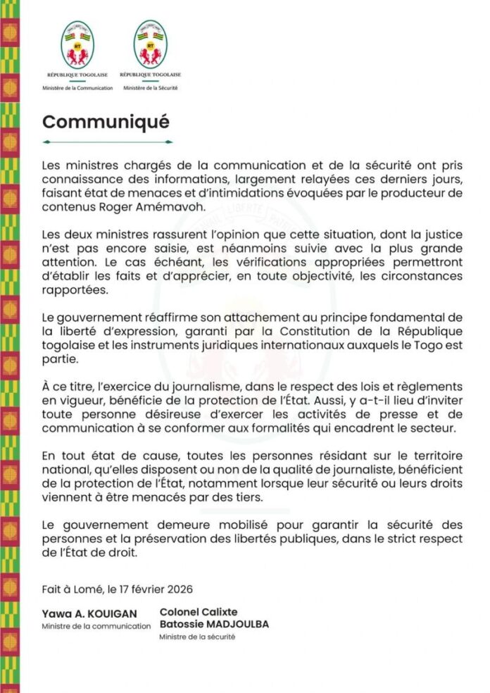 Lomé, 17 février 2026 – Le gouvernement togolais a réagi aux informations faisant état de menaces et d’intimidations présumées visant le producteur de contenus Roger Amémavoh. Dans un communiqué conjoint rendu public ce lundi, les ministres chargés de la Communication et de la Sécurité ont tenu à rassurer l’opinion nationale quant au suivi attentif de cette situation.